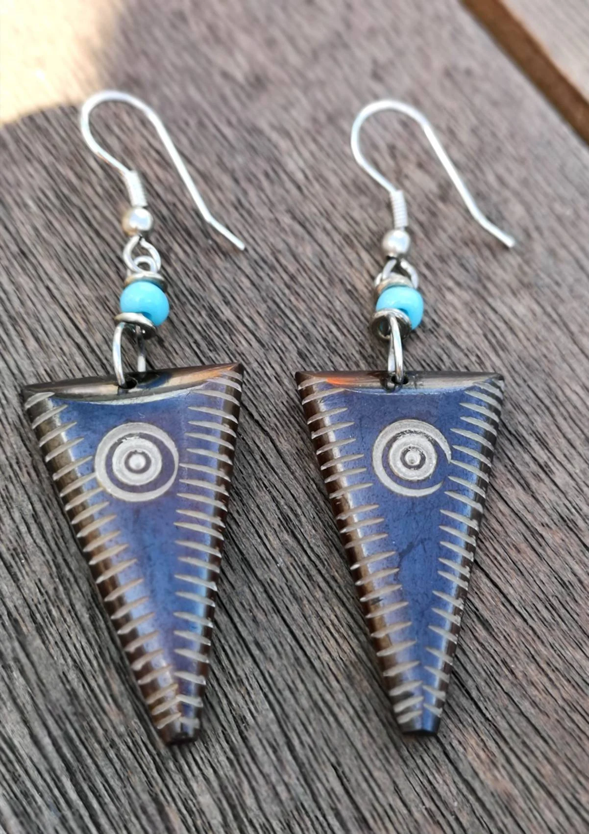 Each pair is handcrafted so no two pairs of earrings are ever identical. It is a highly skilled process to make these earrings. They are made using cow bone and are hand engraved.