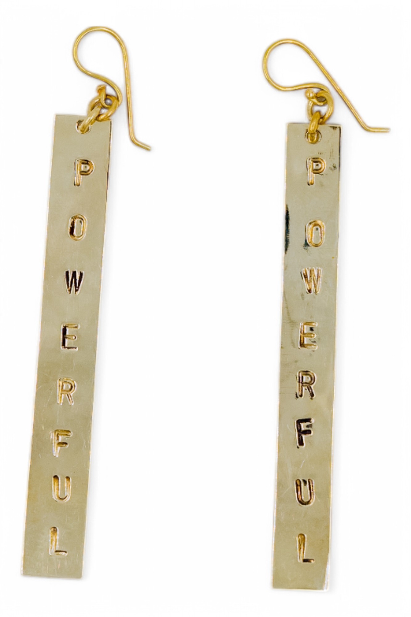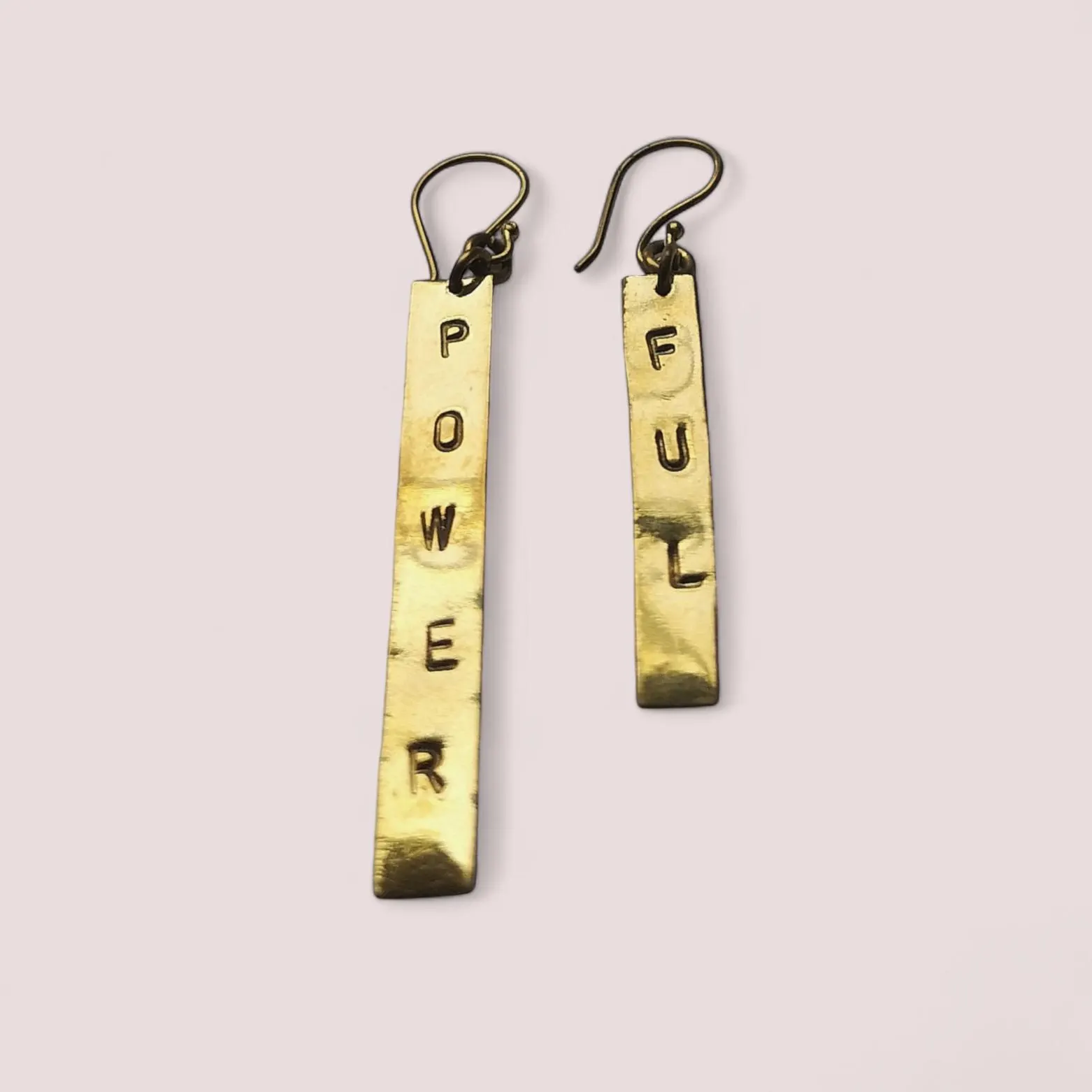 Make a positive statement with these positive affirmation POWERFUL Earrings, handcrafted by skilled artisans in Kibera Slum, Nairobi, Kenya. Made from recycled brass, each pair of earrings is hand stamped carefully to create jewellery with a message.